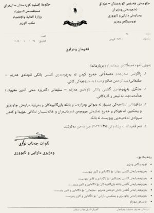 بەگوێرەی نوسراوێکی ئاوات شێخ جه‌ناب، وه‌زیری دارایی و ئابوری کە ئەمڕۆ پێنجشەممە 27ی کانونی دووەمی 2022 دەریکردووە وێنەیەکی دەست “بی ئێن24” کەوتووە، بڕیار درا به‌ راگرتنی سه‌رجه‌م ده‌سه‌ڵاته‌كانی عه‌بدولره‌حمان ساڵح ره‌شید، به‌ڕێوه‌به‌ری بانكی ناوه‌ندی هه‌رێم – سلێمانی.