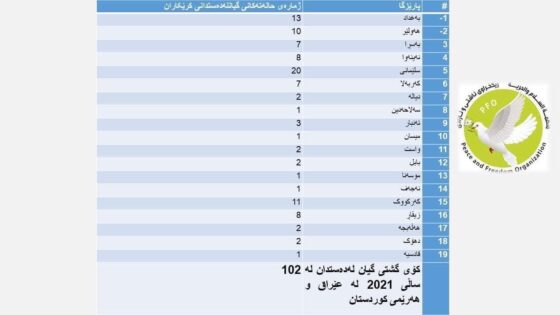 بەپێی ئەو داتایانەی كە بەردەستی ئێمە كەوتوون، لە ساڵی 2021 بەداخەوە رێژەی قوربانی زۆرن، كە لەو ساڵەدا (102) كرێكار لەكاتی كار لە عێراق و كوردستان گیانیان لەدەست داوە. بەم شێوەیەی لای خوارەوە، كە بێگومان ژمارەكە لەوە زیاترە و ئێمە تەنیا دەستمان بەو حالەتانە گەیشتووە و تۆمارمان کردووە:
