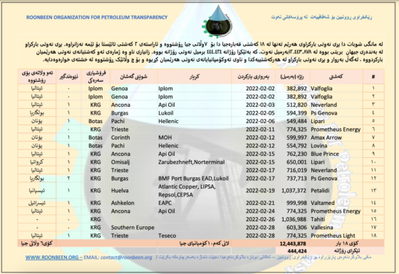ڕێکخراوى ڕوونبین، بۆ شەفافییەتى نەوت و گازى سروشتیی هەرێمى کوردستان، لە ڕاپۆرتێکدا هەناردەى نەوتى هەرێمى بۆ مانگى شوبات ئاشکرا کرد.