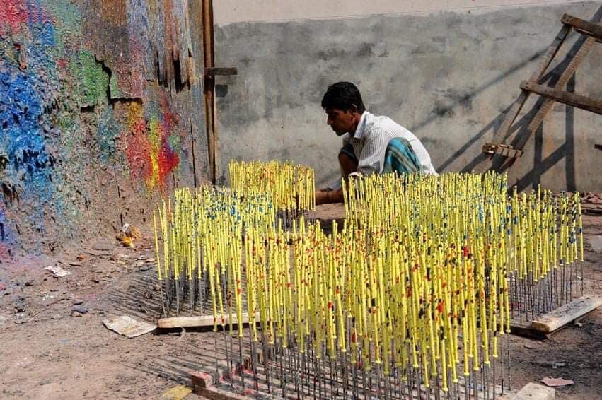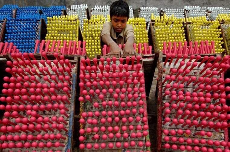 منداڵانی پایتەختی بەنگلادیش، لەبەرامبەر 10 بۆ 25 دۆلاری مانگانەدا، لە شەشی بەیانییەوە بۆ پێنجی ئێوارە كاردەكەن بۆ بەرهەمهێنانی میزەڵان (باڵۆن).