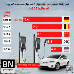 گرافیک.. ئەو وڵاتانەى زۆرترین ئۆتۆمبێلى کارەبایی لە 2021دا دروست کردووە